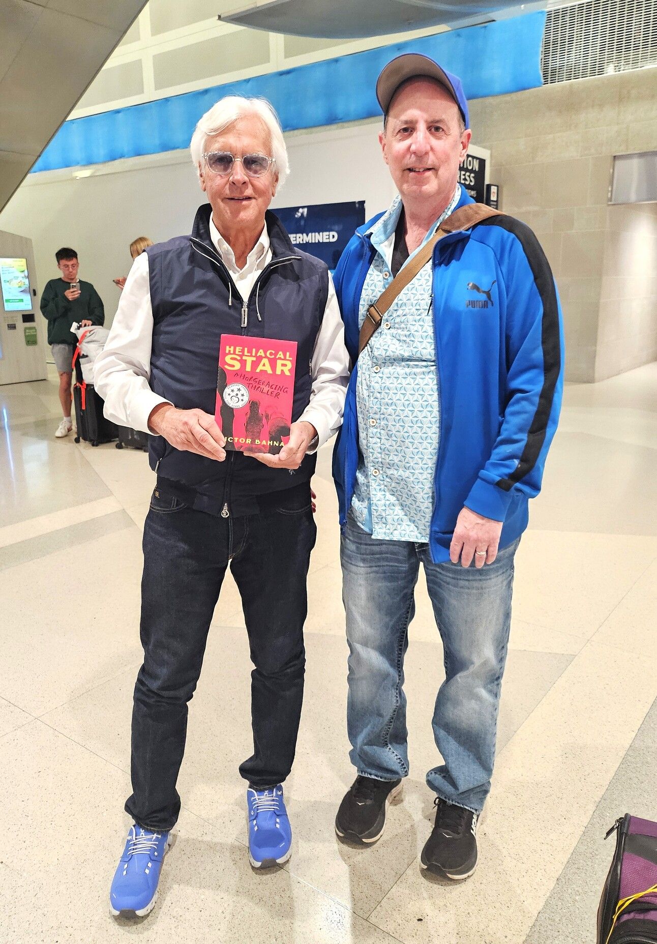 Switching gears, the most famous modern-day trainer today is the very recognizable Bob Baffert. Tied for the most Kentucky Derby wins and one of only two trainers to win the Triple Crown twice, his training accomplishments are impressive. I was on my way to Saratoga last month when I spotted the white-haired trainer at Detroit International. I introduced myself to Bob and his wife Jill Baffert and was pleasantly surprised by his affability and engaging down-to-earth personality. I also happened to have a copy of my novel, Heliacal Star, and used the opportunity to hand it Bob. Perhaps he’ll give the book a 5-star review!